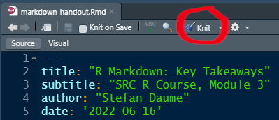 knitr package, an R package conveniently integrated into the R Studio UI..Rmd instead of .md.The YAML header must be placed at the beginning of a document and is enclosed by three dashes ---.